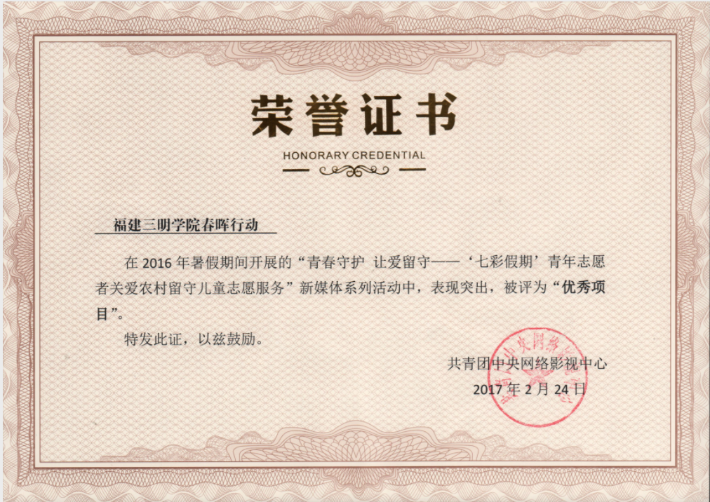 福建三明春晖行动获共青团中央网络影视中心优秀项目
