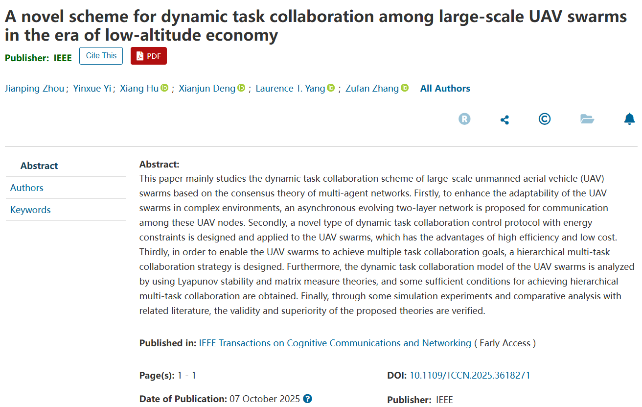 周建萍的研究成果“A novel scheme for dynamic task collaboration among large-scale UAV swarms in the era of low-altitude economy”以低空经济为背景,形成多项创新性成果,一是为提高无人机集群在复杂环境下的适应性,提出了一种用于无人机节点间通信的异步演化双层网络。二是,设计了一种具有能量约束的新型动态任务协同控制协议,并将其应用于无人机集群。三是进一步设计分层多任务协同策略,满足无人机集群实际作业中的多任务协同需求,让集群能够更有序、更高效地完成多目标任务。该研究深化了低空经济领域中无人机集群协同技术的理论探索,为相关技术的实际落地提供了重要参考。