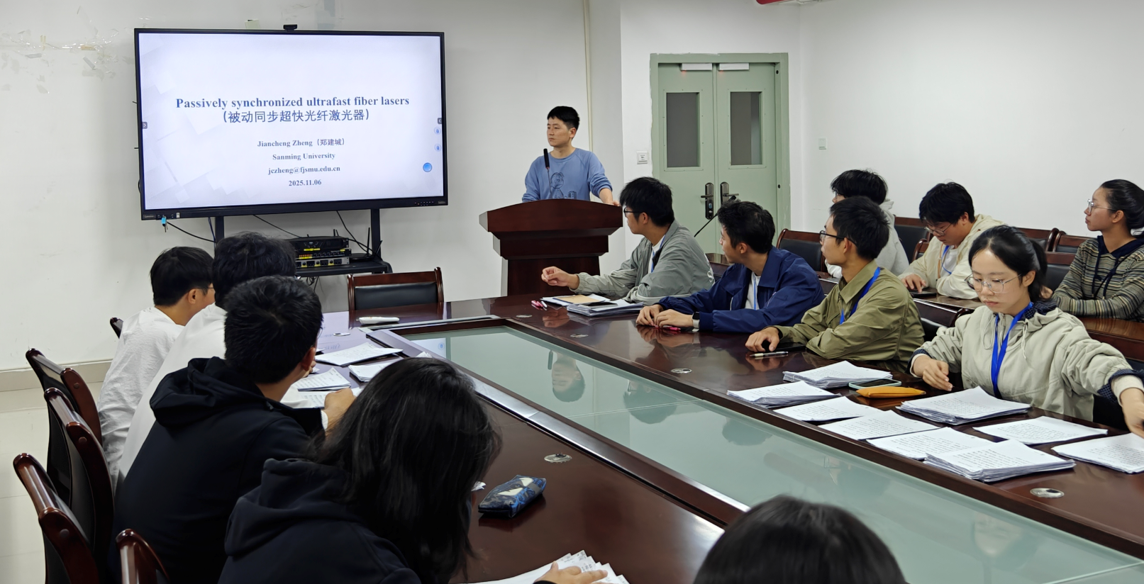 林观俊老师的报告以《大语言模型的进化之路:从GPT到ChatGPT的突破与挑战》为题,为在场师生系统性地梳理了大语言模型的核心概念与发展脉络,深入浅出地阐释了大规模预训练、指令微调与人类反馈强化学习等关键技术如何逐步“雕琢”出ChatGPT惊人的对话与推理能力。郑建城老师带来了题为《被动同步超快光纤激光器:机理、实现与应用》的精彩讲座,重点展示了其团队在超快光纤激光器复合结构上的创新方案和动力学研究,并系统介绍了基于交叉相位调制效应与双壁碳纳米管可饱和吸收体实现多波长超快激光被动同步的前沿研究。