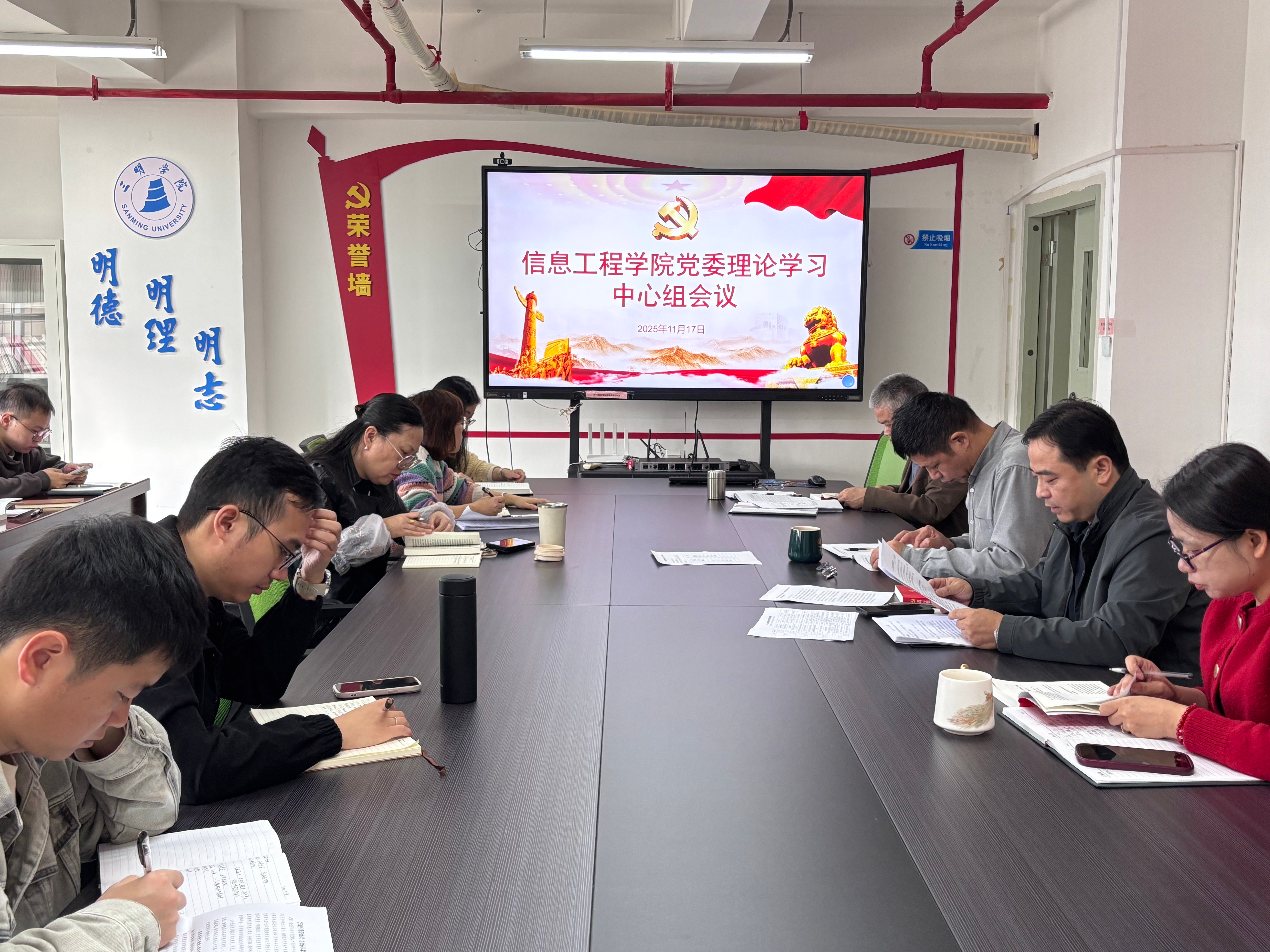 11月17日,信息工程学院党委召开理论学习中心组学习会,对《党的二十届四中全会<建议>学习辅导百问》进行学习。院党政领导班子成员、党支部书记、科级干部、系主任、组织员、辅导员等参加学习,院党委书记李金波主持学习会。