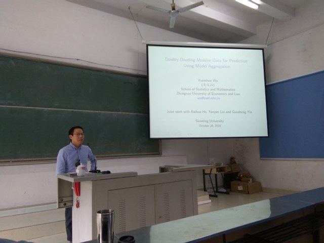 应三明学院信息工程学院的邀请,10月26日,复旦大学公共卫生学院生物统计系秦国友教授和中南财经政法大学吴远山教授分别作了题为《Multiply Robust Estimation for Longitudinal Data with Dropouts and Outliers》和《Doubly Dividing Massive Data for Prediction Using Model Aggregation》的学术报告。报告会由信息工程学院院长邱锦明教授主持,信息工程学院100多位师生参加了报告会。