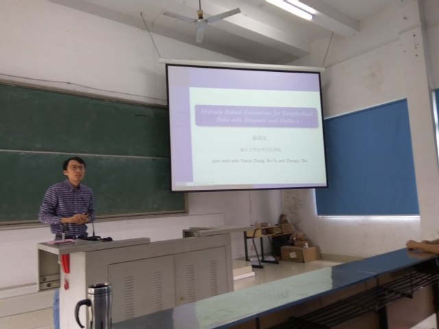 报告中,秦国友教授详细地讲授了一种多重稳健估计方程来分析含有缺失和异常值的纵向数据,在一定的正则性条件下,建立了估计量的一致性和渐近正态性,并将所提出的方法应用于类风湿关节炎患者的纵向数据研究;吴远山教授的报告则是针对现实生活中的海量数据问题,应用机器学习中的模型聚合,提出了用divide and conquer算法来进行海量数据预测。报告会结束后,两位教授还就统计及大数据研究中的一些问题与各位参会的师生进行了广泛的交流,并详细地解答了参会的部分老师和同学提出的问题,包括学习方法和研究方法。
